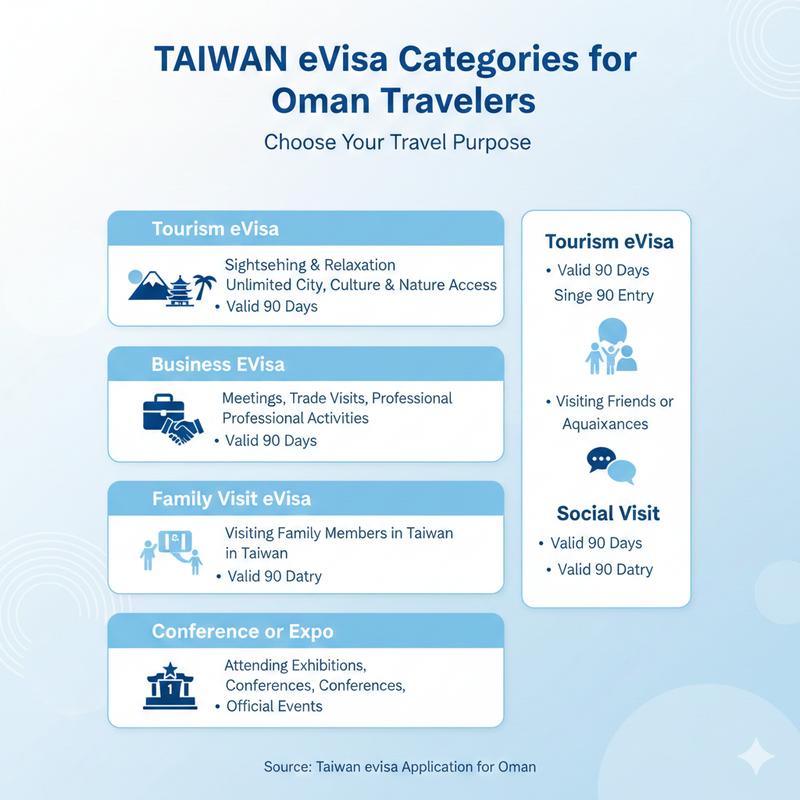 When the time comes to submit eVisa Application for Taiwan from Oman, the travelers will have to pick one among several eVisa categories according to the travel purpose. The following types of Taiwan eVisa are available: