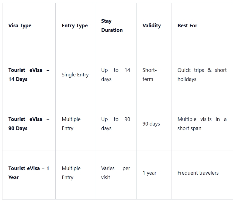 Visa Type | Entry Type | Stay Duration | Validity | Ideal For |