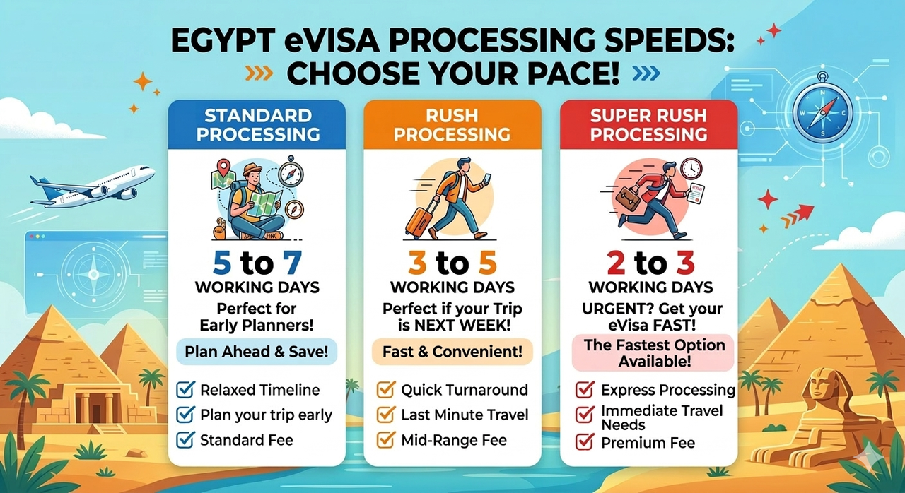 We understand that travel planning can sometimes be last-minute. To accommodate everyone, there are three main processing speeds available for the Egypt eVisa: